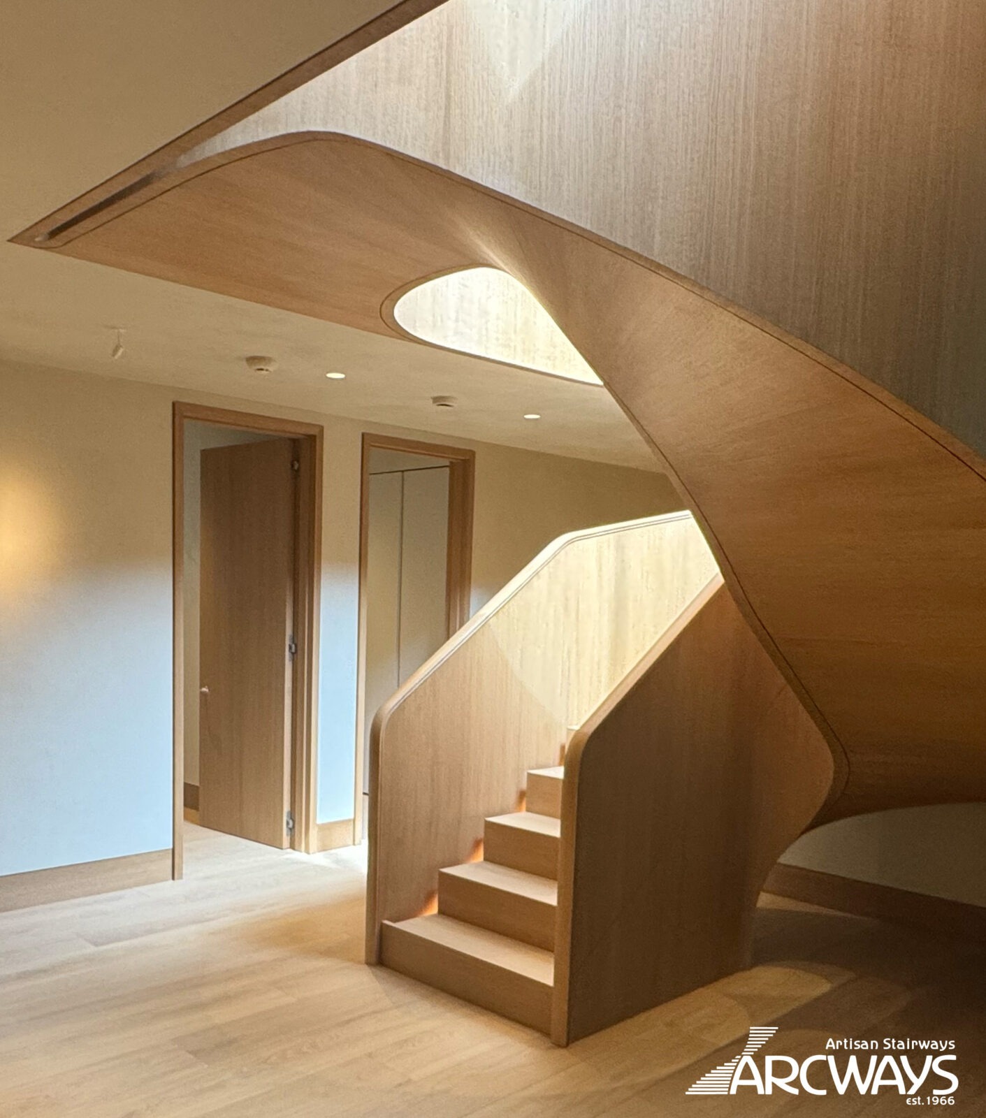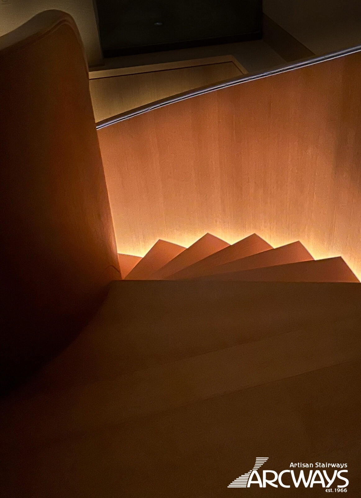 When stairs are underlit, the artistic elements of our artisan-built stairways are enhanced while adding the perfect element of safety. By utilizing wire chased LED lighting, Arcways can provide stairway lighting for any of our staircase design projects, adding aesthetic beauty and ensuring safer egress for everyone using the staircase. Browse our extensive portfolio of residential and commercial stairway lighting projects and see the difference LED lighting makes!